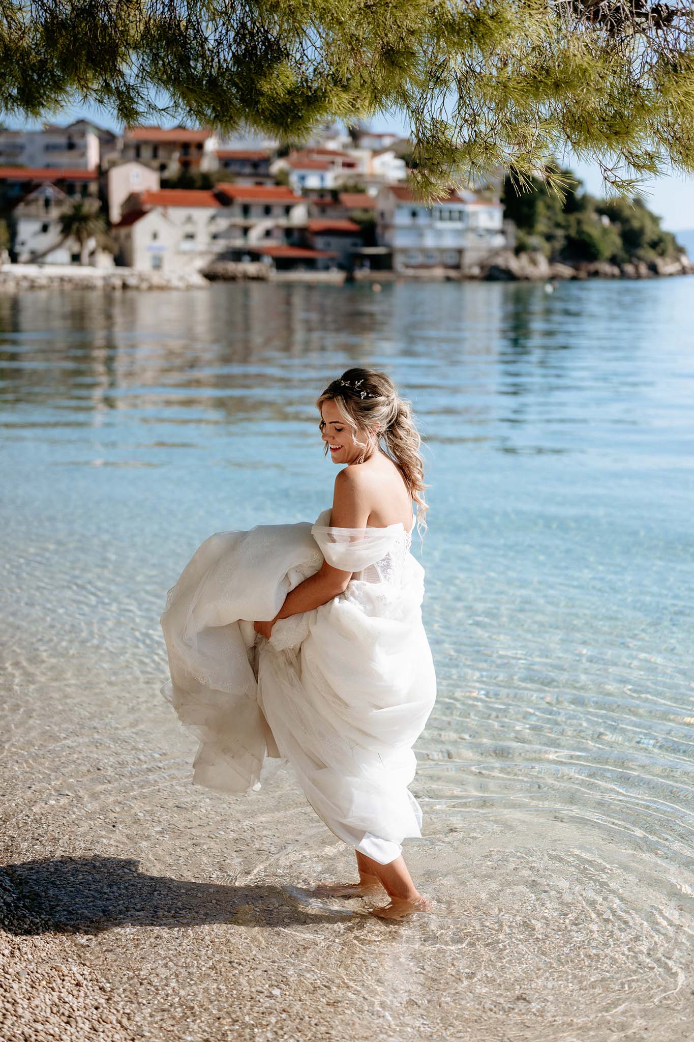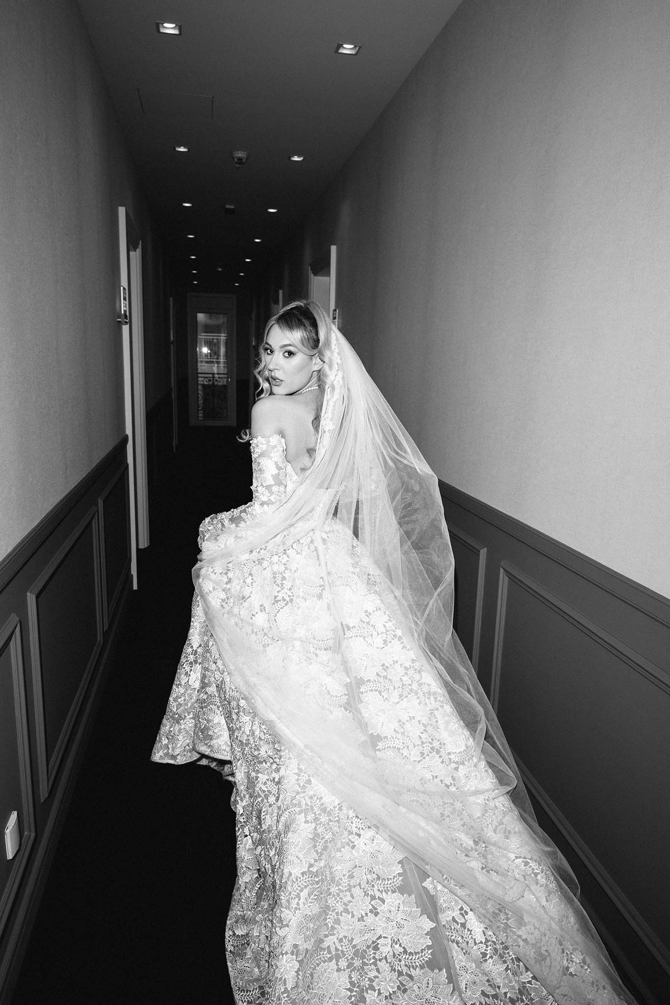 Bride in a modern fashion-style wedding dress posing thoughtfully with a subtle, mysterious smile in Slavonski Brod.