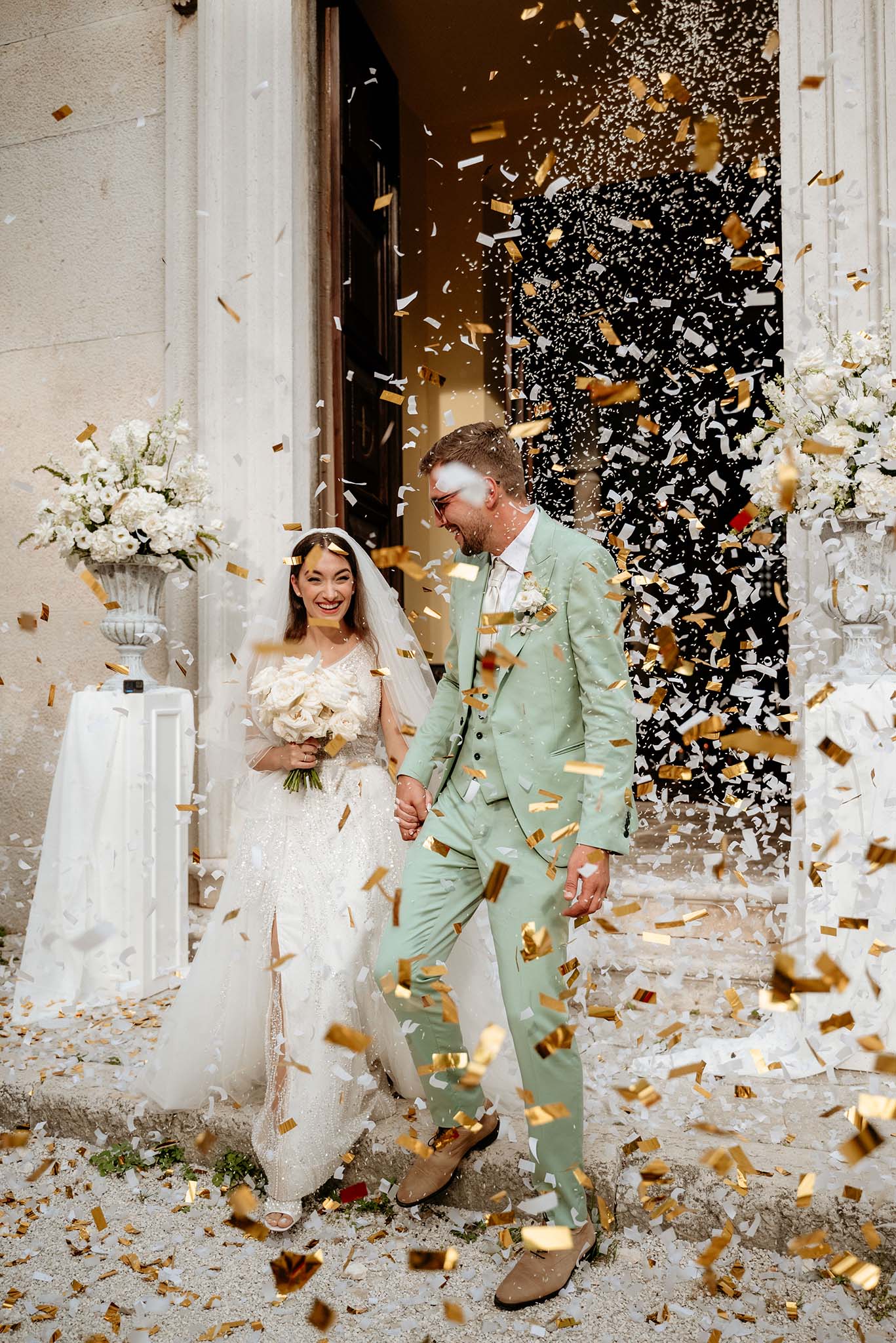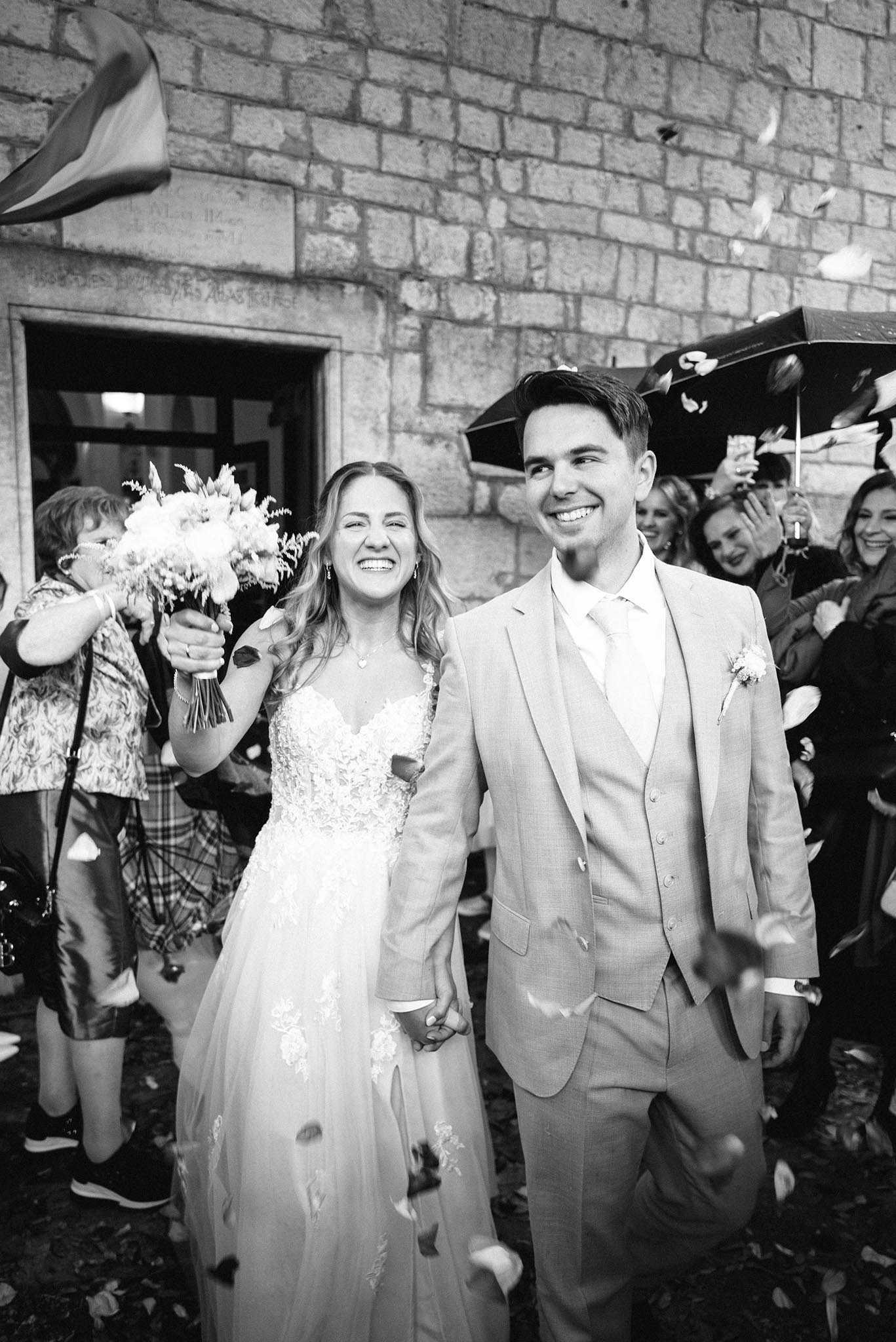 Bride and groom exiting the church after their wedding in Bale – Istria wedding photography
